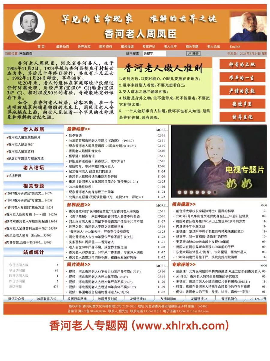 "香河老人专题网(www.xhlrxh.com)”自2011年9月开通以来,报道了大量有关香河老人周凤臣的信息与资料,积累了大量宝贵的实时信息和历史资料。近期对网站落后的技术平台进行了全面升级与更新,为网站长期稳定工作奠定了坚实基础,现已重新对外界开放,欢迎各界人士关注浏览、评论投稿并提出积极建议。